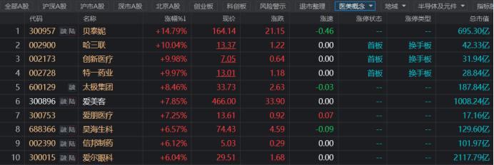 财联社(上海,编辑 梓隆)讯,今日(10月26日),医美板块大幅活跃,截止收盘,板块指数涨幅近4%。个股方面,哈三联(002900)、创新医疗(002173)、特一药业(002728)涨停,贝泰妮涨幅近14.8%,此外,太极集团(600129)、爱美客、爱朋医疗(300753)等股也涨幅居前。其中,行业龙头爱美客今日成功回升至千亿元市值,且收复近日的深跌。